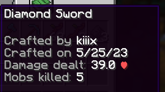 See the tool/armor owner/trader/looter, craft date, blocks broken, damage dealt, damage absorbed, mobs killed, sheep sheared, fish caught, and more stats, bound to all tools and armor in the item lore